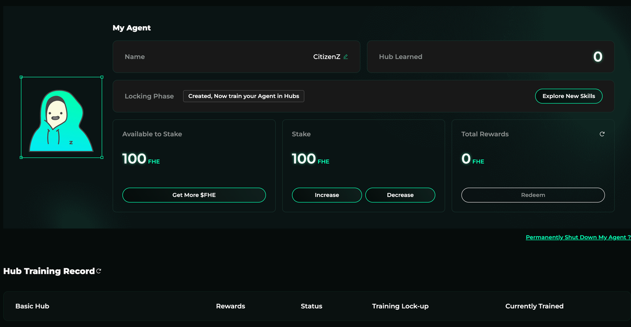 * Your agent’s earned **$FHE rewards** is subject to the first 30-day lock-up period, after 30 days, you can redeem it at any time.